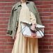 牛革を使った持ち手部分のかがりステッチと下がりリボンがアクセントになっています。