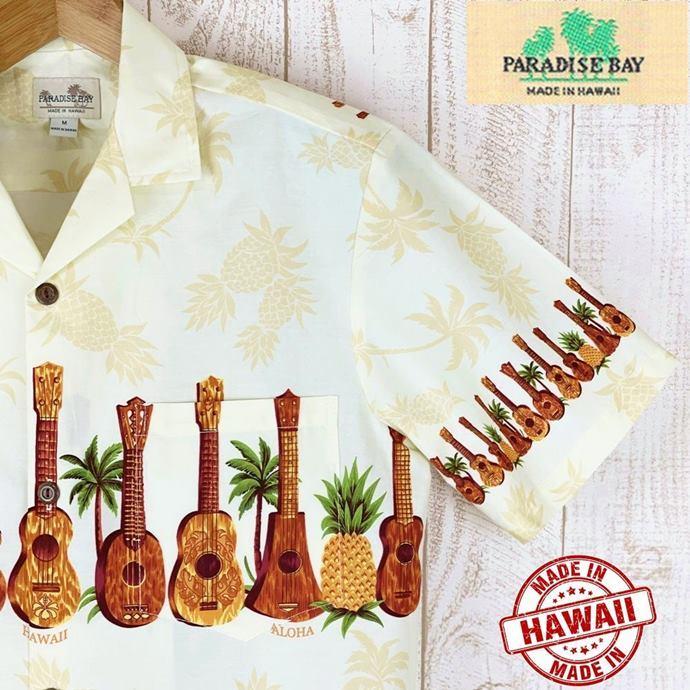 アロハシャツハワイ製ParadiseBayウクレレ・ライトイエロー・フロントマッチング薄黄綿ギフト・プレゼント【メール便送料無料】(宅配便別途)