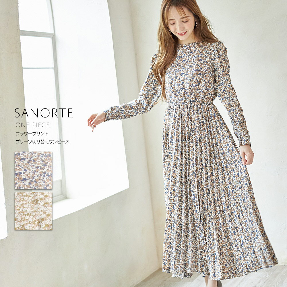 フラワープリントプリーツ切り替えワンピース【sanorte サノート】tocco closet(トッコクローゼット) アイボリー ベージュ
