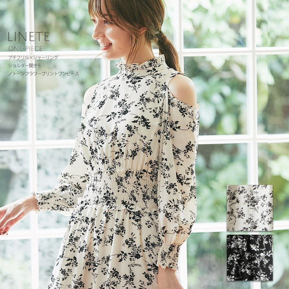 プチフリル×シャーリングショルダー開きモノトーンフラワープリントワンピース【linete リネット】tocco closet(トッコクローゼット) アイボリー ブラック