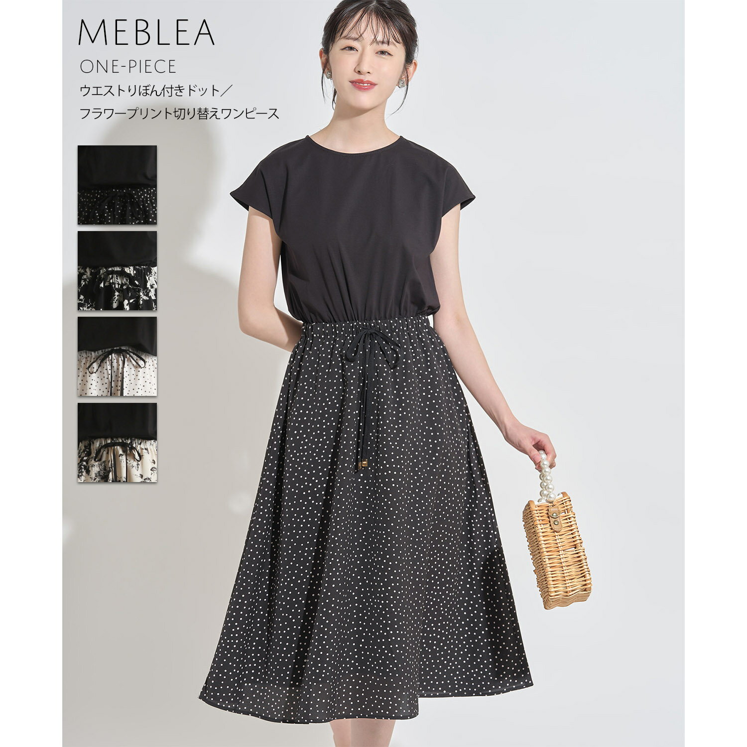 ウエストりぼん付きドット/フラワープリント切り替えワンピース【meblea ミブリア】tocco closet(トッコクローゼット) オフホワイトドット ブラックドット オフホワイトフラワー ブラックフラワー 商品番号:186-177652