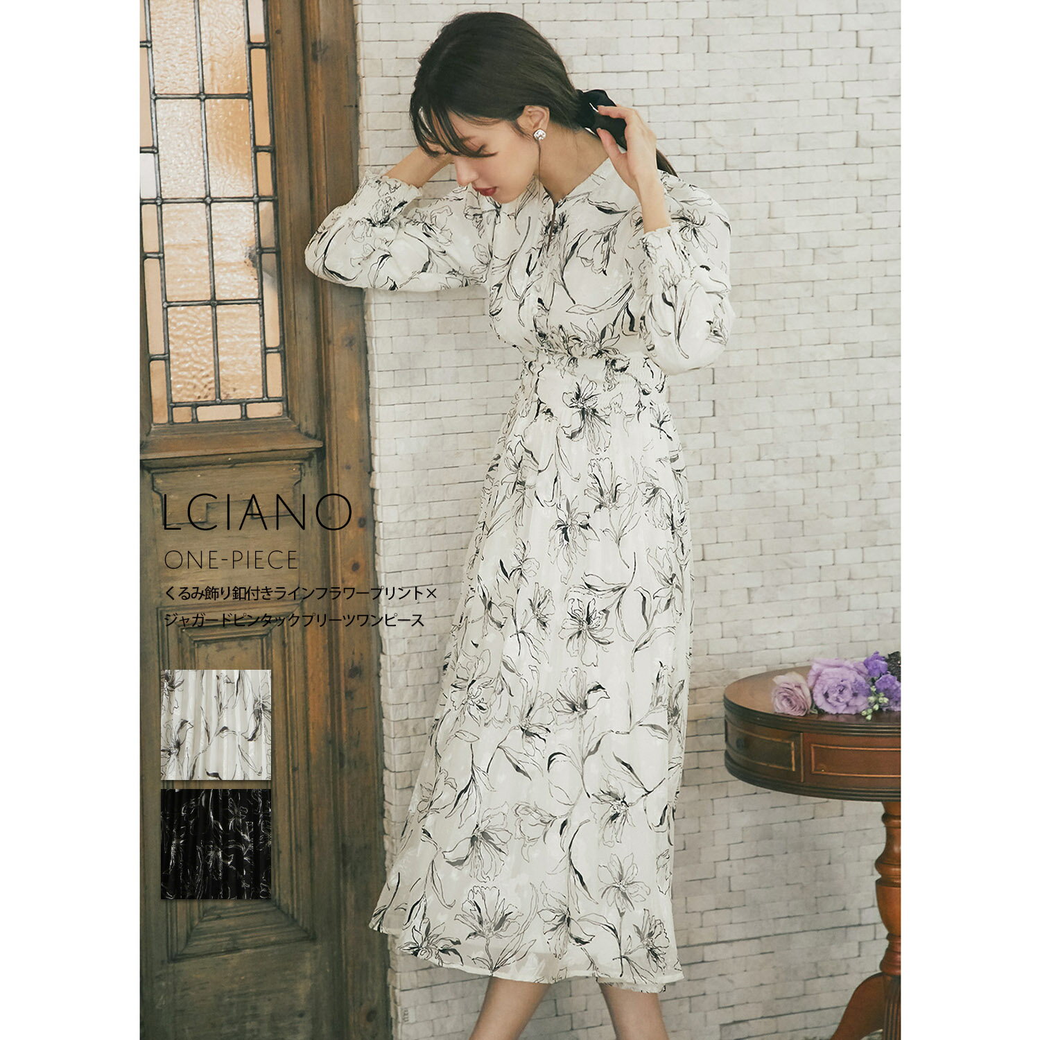 くるみ飾り釦付きラインフラワープリント×ジャガードピンタックプリーツワンピース【lciano ルシアノ】tocco closet(トッコクローゼット) ※愛甲千笑美さんはアイボリー着用 アイボリー ブラック 商品番号:186-178870