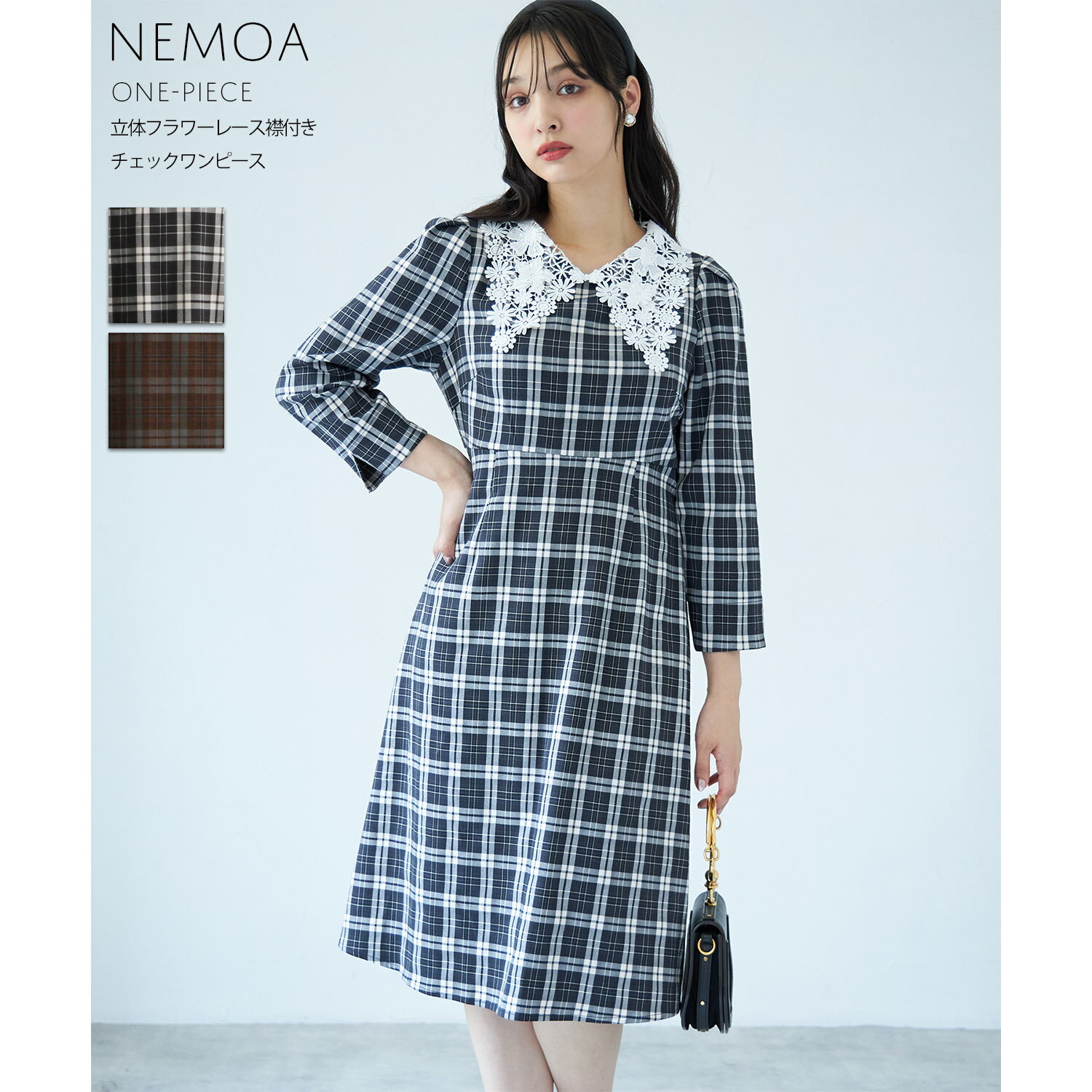 立体フラワーレース襟付きチェックワンピース【nemoa ネモア】tocco closet(トッコクローゼット) ブラック ブラウン 商品番号:186-178088