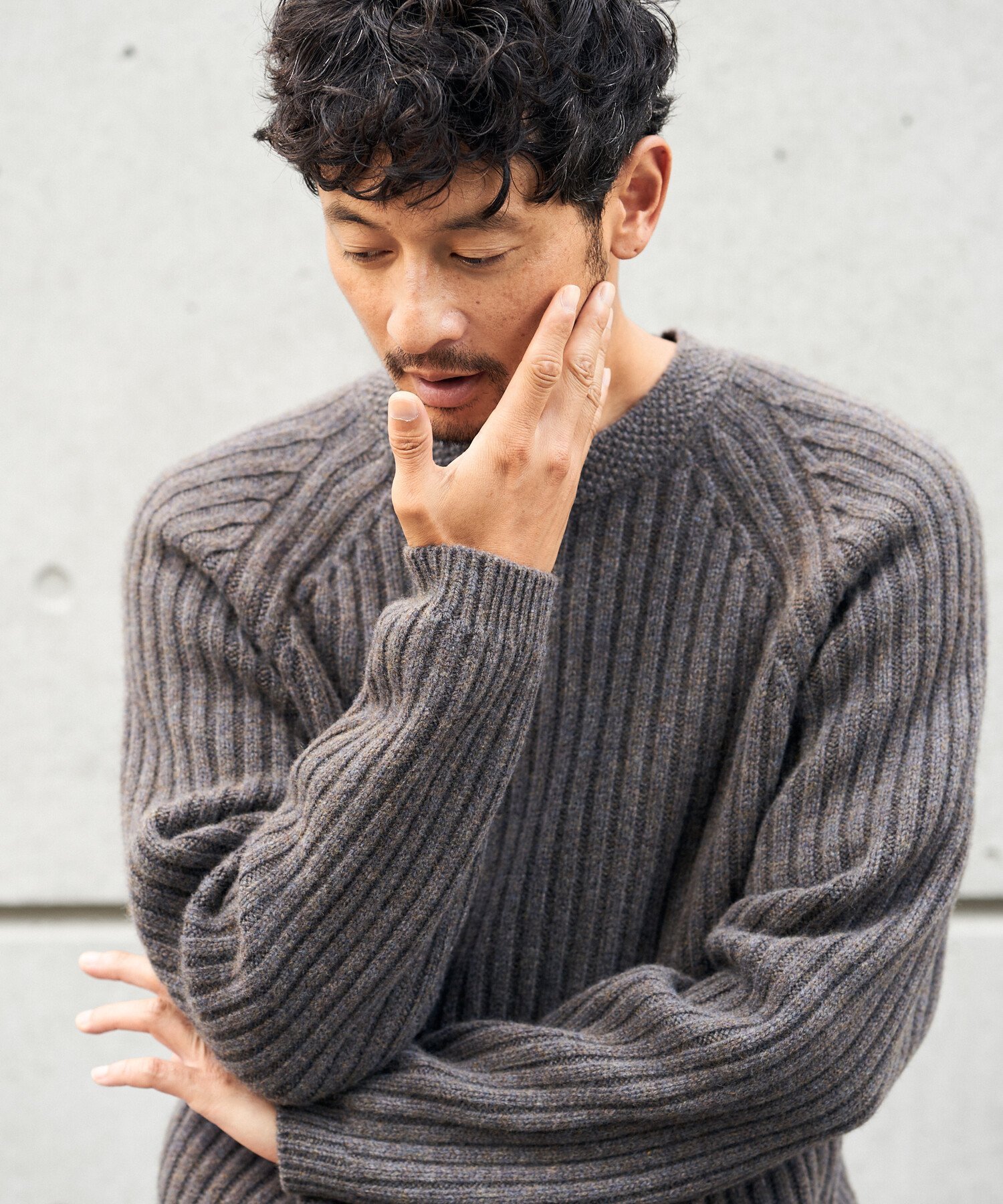 こちらは、太目のリブがアクセントになる、クルーネックニットです。