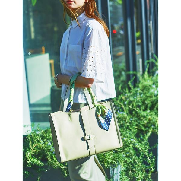 こちらは、ベルトデザインと口元の緩やかなVラインですっきりした印象のA4サイズ対応のトートバッグです。