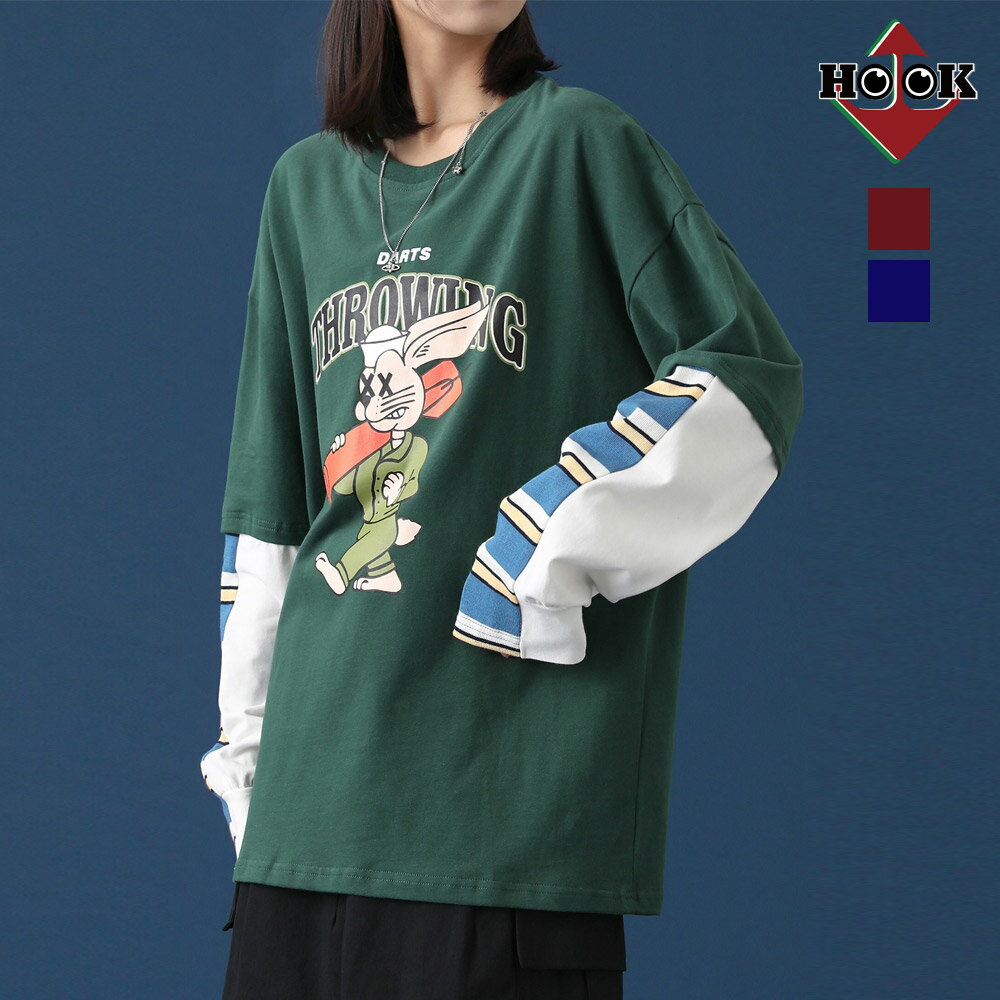 tシャツTシャツ【HOOK】【人気アイテム】重ね着風長袖tシャツフロントプリント入り
