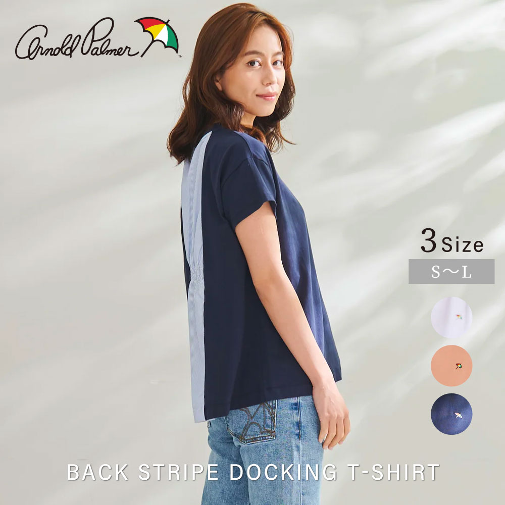 【公式】 セール 20%OFF アーノルドパーマー バック ストライプ ドッキング Tシャツ レディース ホワイト ベージュ ネイビー シンプル カジュアル 春 夏 ママ 仕事 通勤 通学 公園 おでかけ デイリー 背中ギャザー 異素材ドッキング 無地 ストライプ 23ss