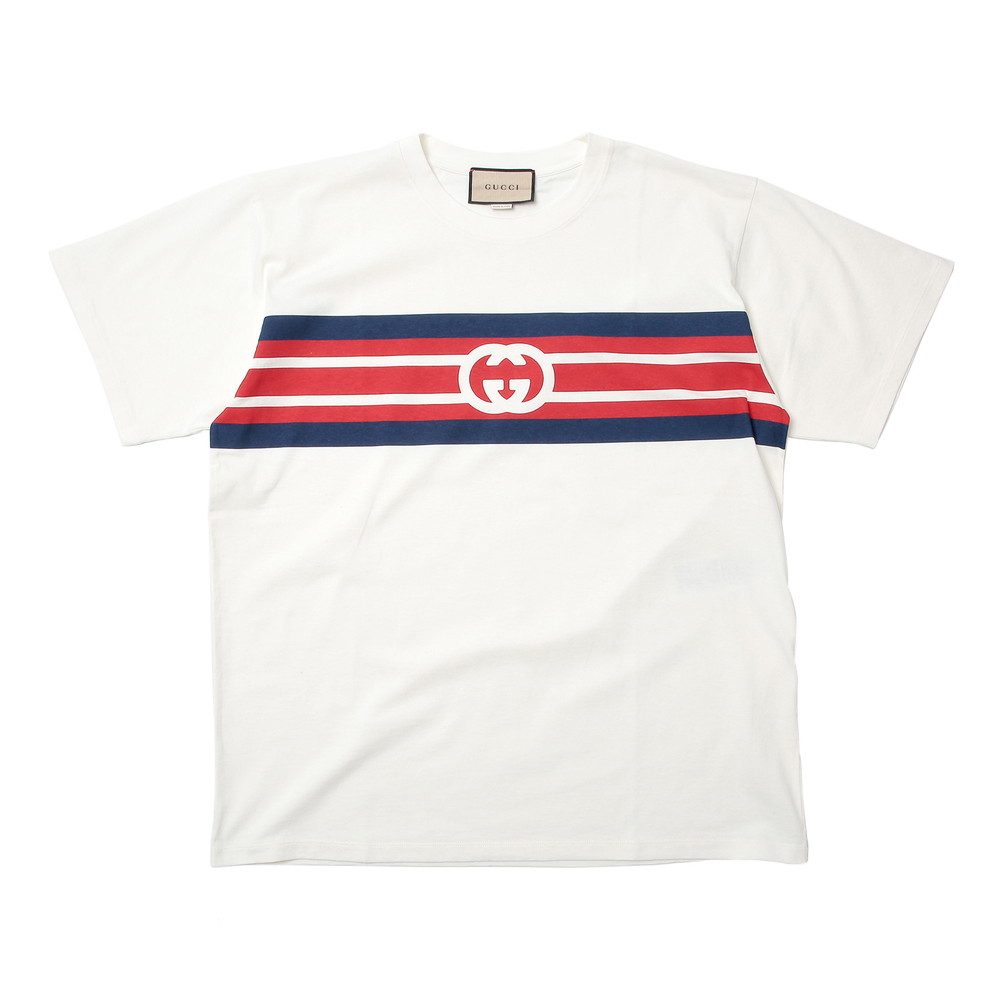 グッチ GUCCI 半袖Tシャツ 616036 XJDAG メンズ トップス 半袖 インターロッキングG ストライプ Tシャツ プリント ボーダー カジュアル クルーネック ブランド オフホワイト S M L