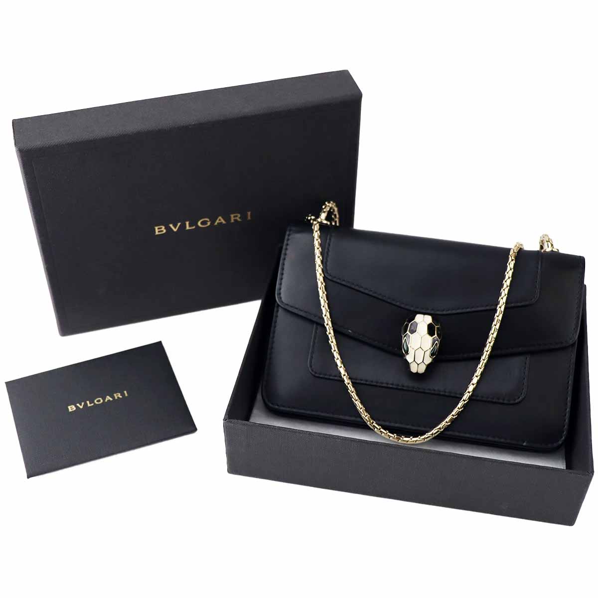 BVLGARIブルガリセルペンティフォーエバースモールチェーンレザークラッチバッグブラックライトゴールドプレートブラス金具イタリア黒