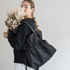 HAYNI(ヘイニ)の「gosare-m(ゴサレMサイズ)」は、サイドのロープでフォルムを変えられる、軽量で大人可愛いナイロン製ドローストリングトートバッグです。