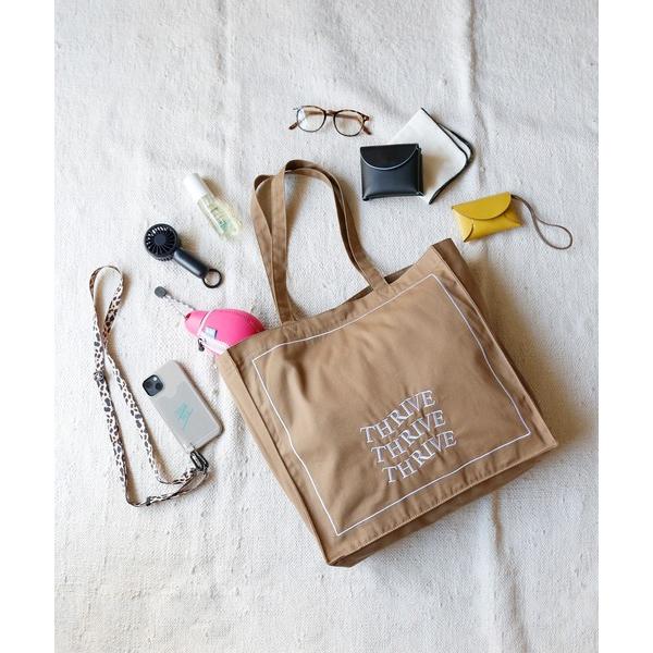こちらは、「流行る/成長する/のびのび」という意味の、“THRIVE”とスクエアラインの刺繍がポイントの、シンプルなデザインのマチありトートです。